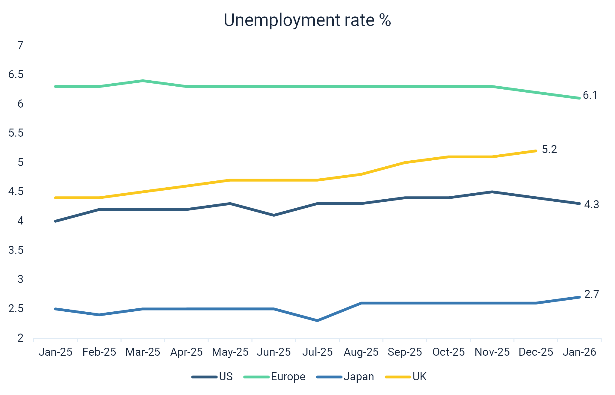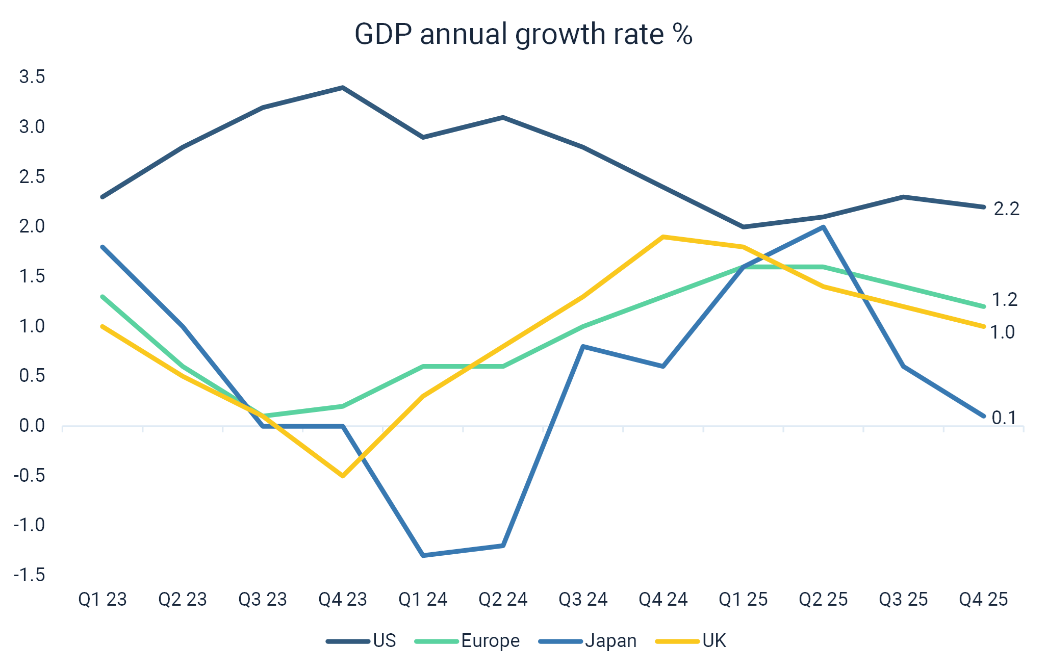 Broad economic growth eased towards the end of 2025, although it remains at healthy levels with positive momentum. The outlook remains for growth in 2026 to be at or above trend, supported primarily by continued strength in the United States. The US economy is still benefitting from vast amounts of AI capital expenditure, falling interest rates and low unemployment, which could help offset the geopolitical turbulence emanating from the US.[1] A prolonged oil price rise could reduce economic growth through 2026 if we see significant supply disruptions.[2] Europe, UK and Japan are more exposed to rising energy prices as they are large energy importers.