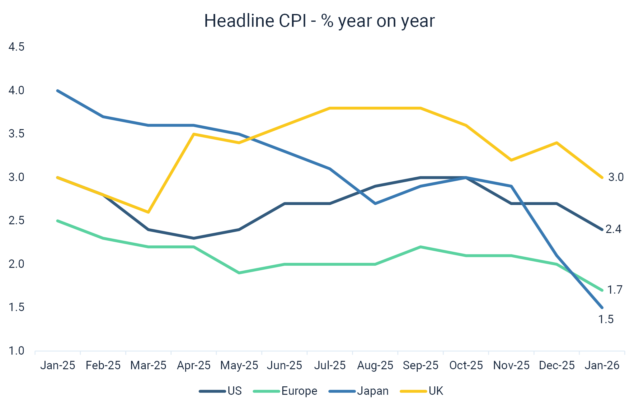 Fourth quarter corporate earnings results were robust. Corporates are still in a healthy position given resilient economies, positive consumers and rising wages. US technology companies were strong, but there was more dispersion between companies during this quarter, with the market starting to tire of the huge capital expenditure announcements. Looking forward, analysts expect healthy 19.6% earnings growth for global equities over the next 12 months. Regionally, Emerging Market earnings are forecast to grow quickest over the next 12 months, at 39.9%, with Asia ex-Japan corporate earnings also forecast to grow strongly at 38.9%. The UK and Europe have more subdued forecasts at 9.5%, and 11% respectively, but across the board the expectation is that 2026 will be another strong year for corporates. All regions are trading in line with their long term averages on a price to earnings multiple, except Emerging Markets and Asia ex-Japan which are trading slightly below. This consensus earnings and valuation data is taken from Bloomberg.