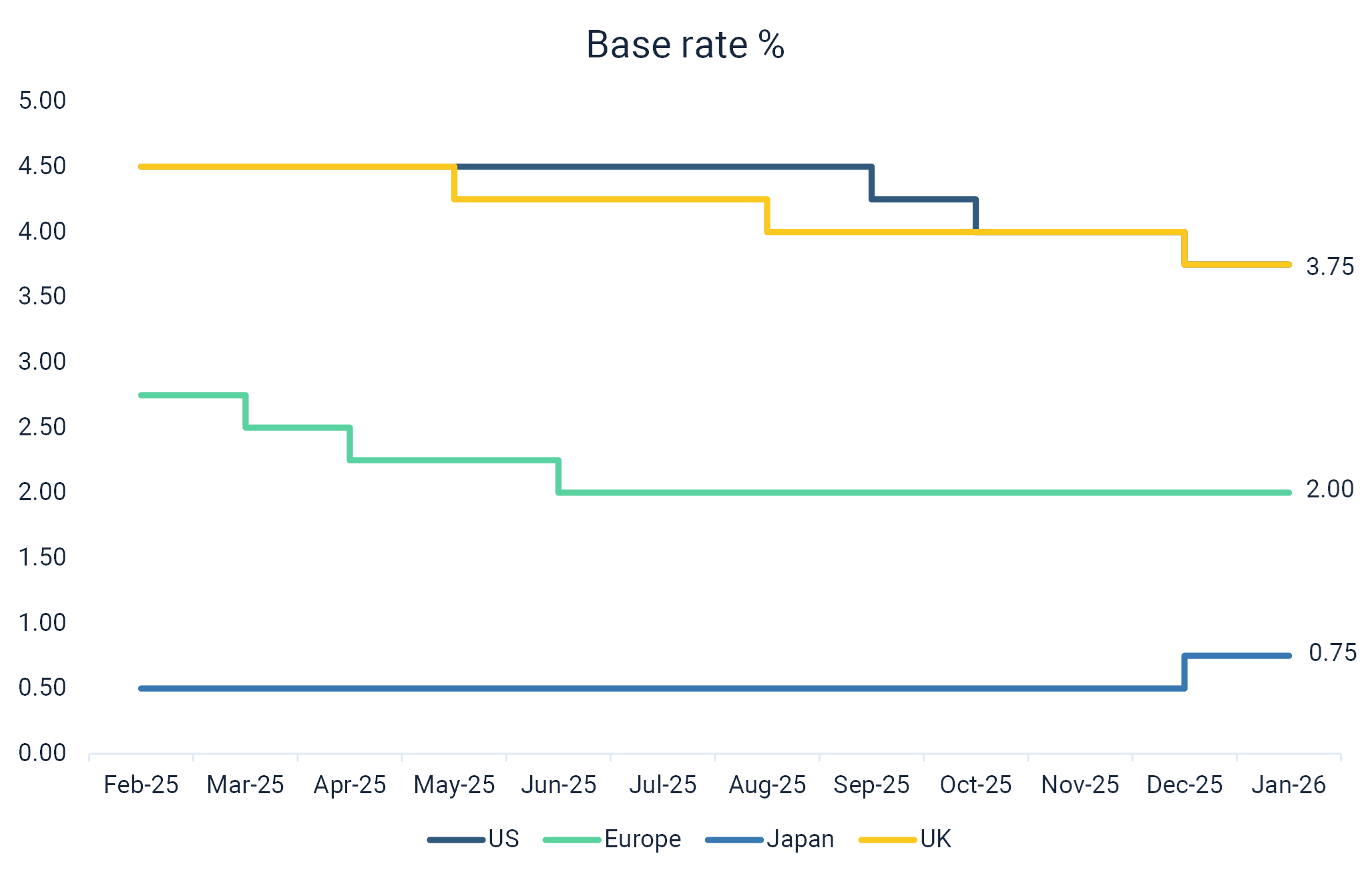 Inflation continues to fall and is now almost in line with central bank targets. The exception to this is in the UK, where inflation, even though it has fallen, is still significantly above the Bank of England’s target. [3]  The increase in US tariffs has not had a meaningful impact on inflation in the US, however, a prolonged oil price shock could cause inflation in all regions to start picking back up, akin to 2022 when Russia invaded Ukraine.