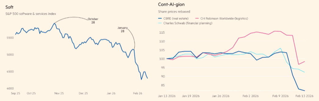 The first sector to feel the wrath of the AI scare trade was software, in what is being touted as the ‘SaaS-pocalypse’.[5] Given the advances in AI tools that can write code, serious concerns have been raised over the core subscription models and pricing power of software companies. Popular stocks and indices in the sector have fallen between 20% – 30%, as investors work through the impact on individual companies’ business models from the new tools. This is made more difficult as more AI productivity tools are released each week.