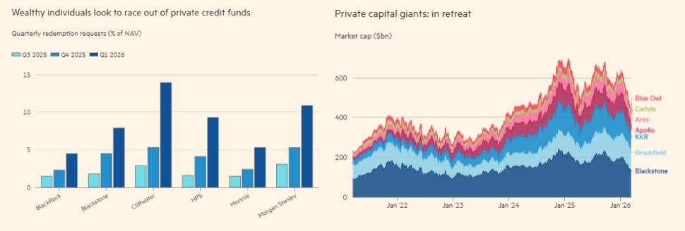 This is more acute in the private credit funds targeting retail investors, as these funds have typically been offered as ‘semi-liquid’, resulting in an even more extreme liquidity mismatch. Big names like BlackRock, Morgan Stanley, Blackstone and Blue Owl have all been affected.
